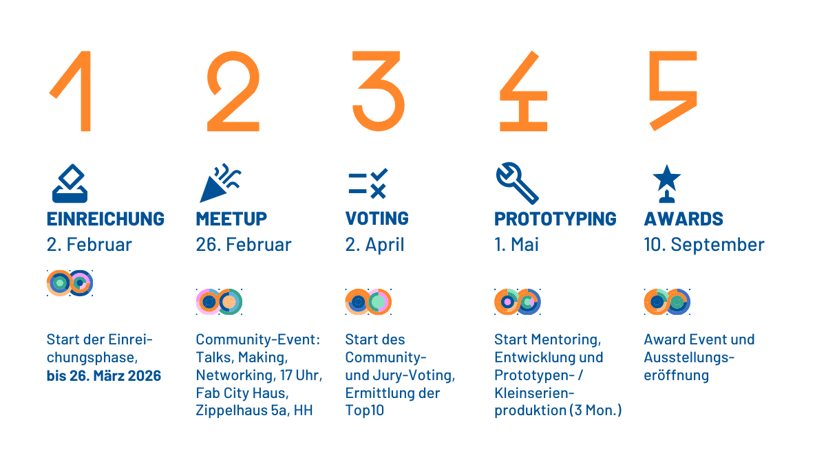 Der Wettbewerb richtet sich an alle Bürger:innen aus der Metropolregion Hamburg, an Schüler:innen, Azubis, Studierende, Start-ups, Laien wie Profis und Betriebe. Bis zum 26. März 2026 können Ideen über die Innovationsplattform der “Fabrication City” (Fab City Hamburg) online eingereicht, kommentiert und weiterentwickelt werden.